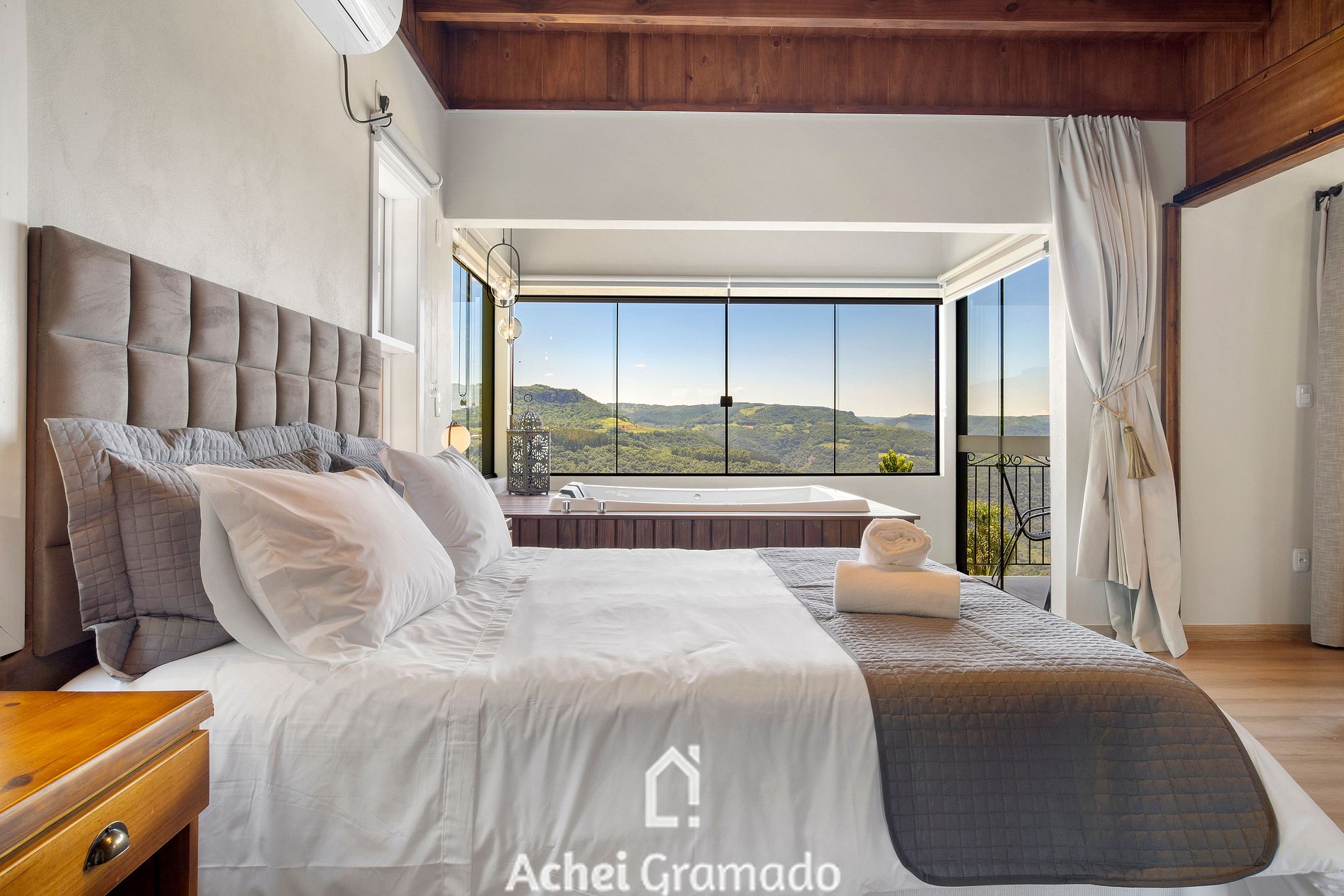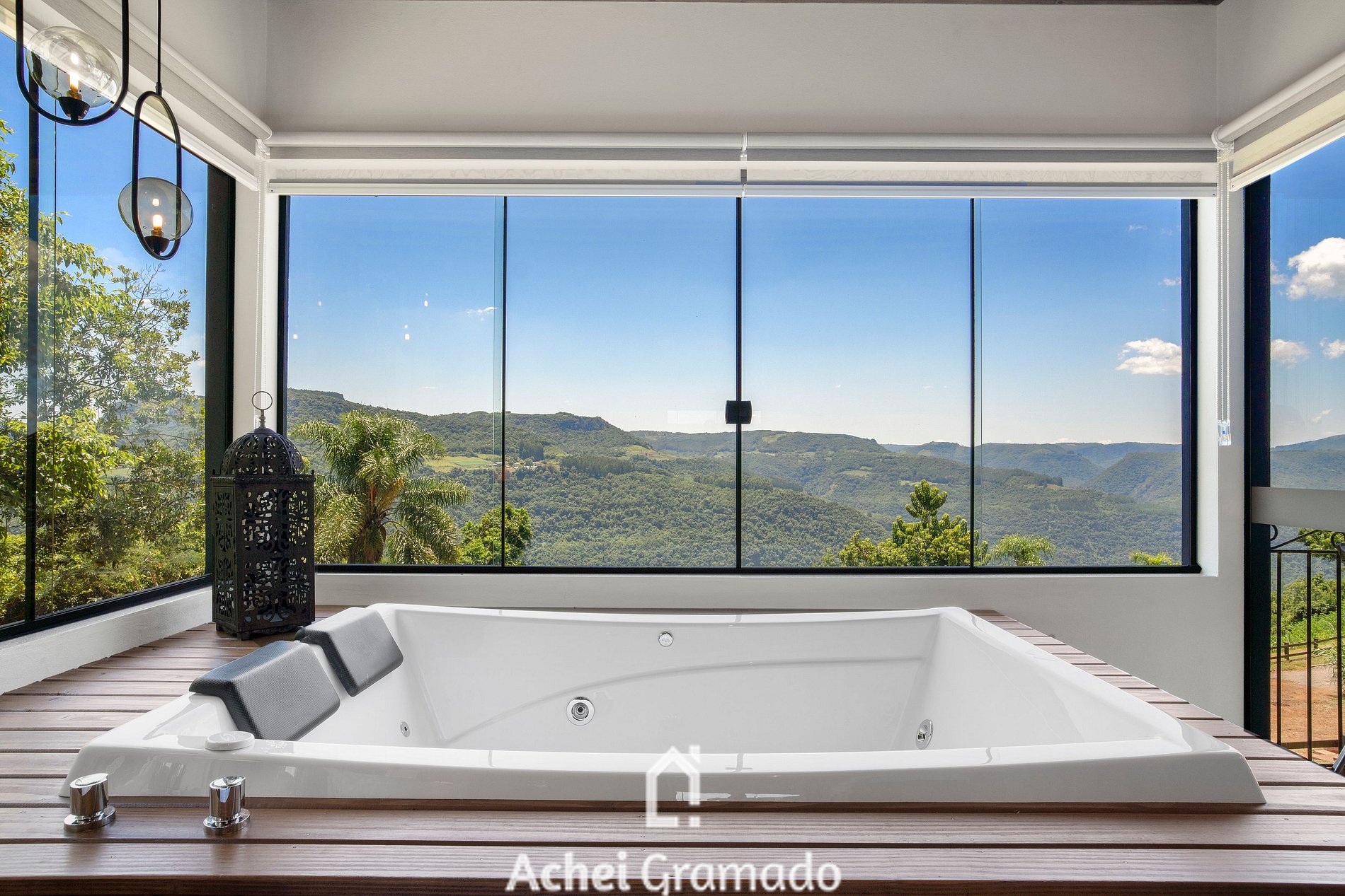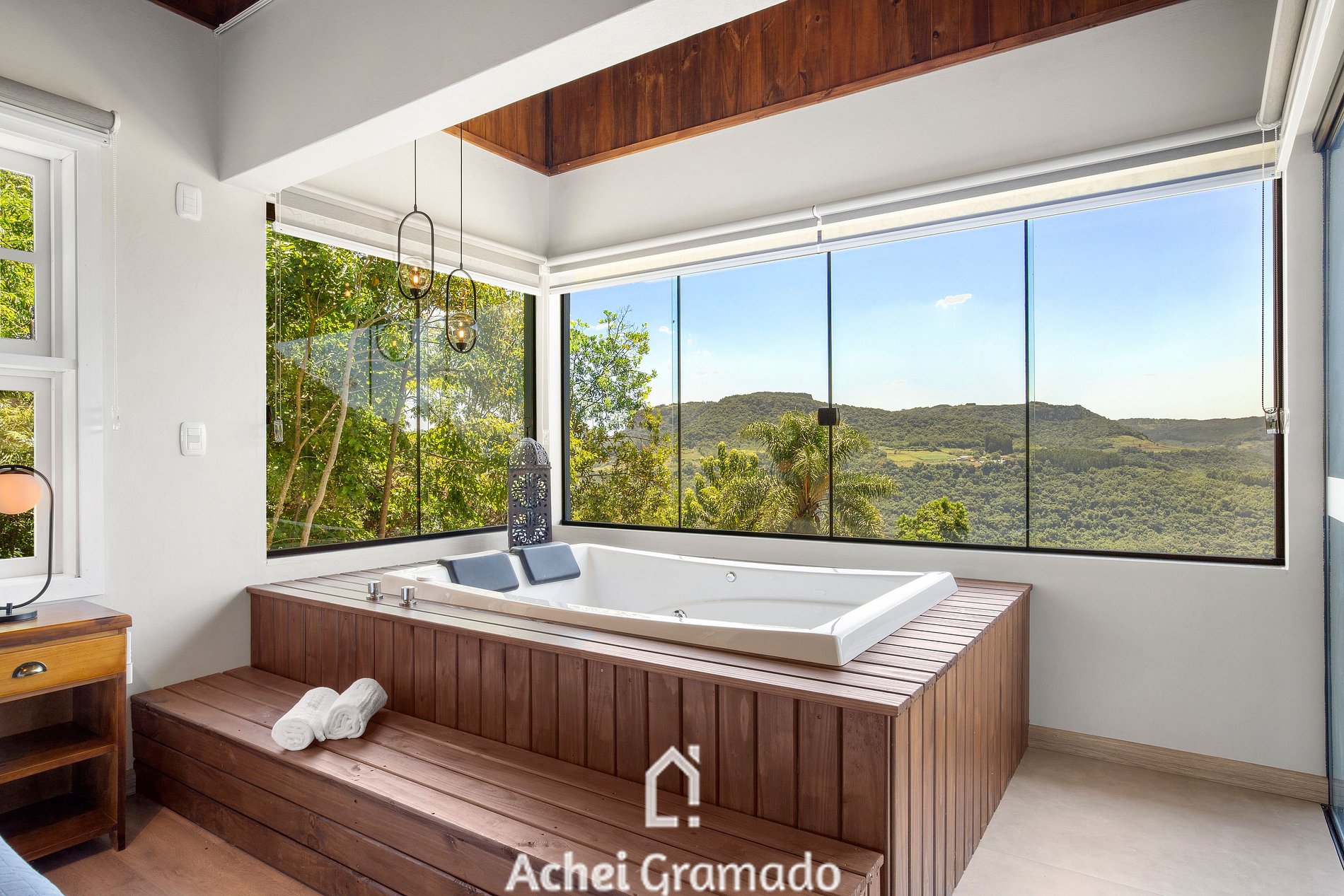 A cabana conta também com 70m2 distribuídos em um ambiente especialmente integrado! Sendo uma suíte com banheira de hidromassagem, ar condicionado quente/frio. Espaço de convivência com lareira, mesa de jantar, cozinha completa com fogão de indução, churrasqueira interna, microondas, cafeteira, sanduicheira e os mais variados utensílios e taças! Smart TV de 50" na sala de estar, e Smart 42" na suíte, internet via fibra óptica e janela panorâmica com black-out, além de chuveiros e torneiras com aquecimento a gás.Não é fornecido lenha ou carvão para a lareira e churrasqueira.