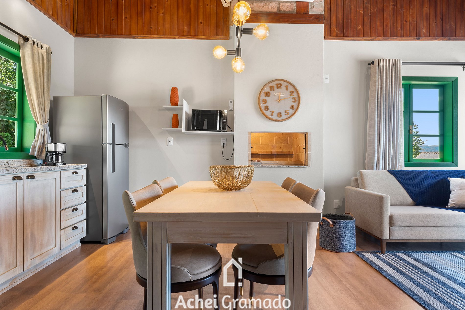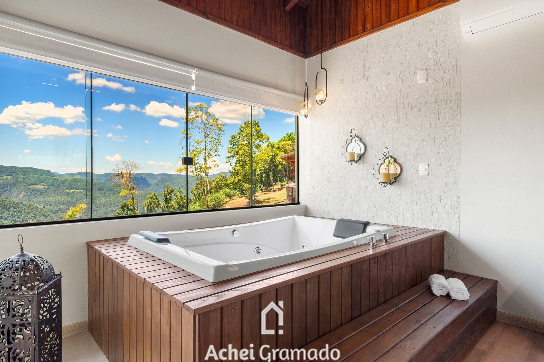 A cabana também conta com 70m2 distribuídos em um ambiente especialmente integrado! Sendo uma suíte com banheira de hidromassagem, ar condicionado quente/frio. Espaço de convivência com lareira, mesa de jantar, cozinha completa com fogão de indução, churrasqueira interna, microondas, cafeteira, sanduicheira e os mais variados utensílios e taças! Smart TV de 50" na sala de estar, e Smart 42" na suíte, internet via fibra óptica e janela panorâmica com black-out, além de chuveiros e torneiras com aquecimento a gás. Não é fornecido lenha ou carvão para a lareira e churrasqueira.
