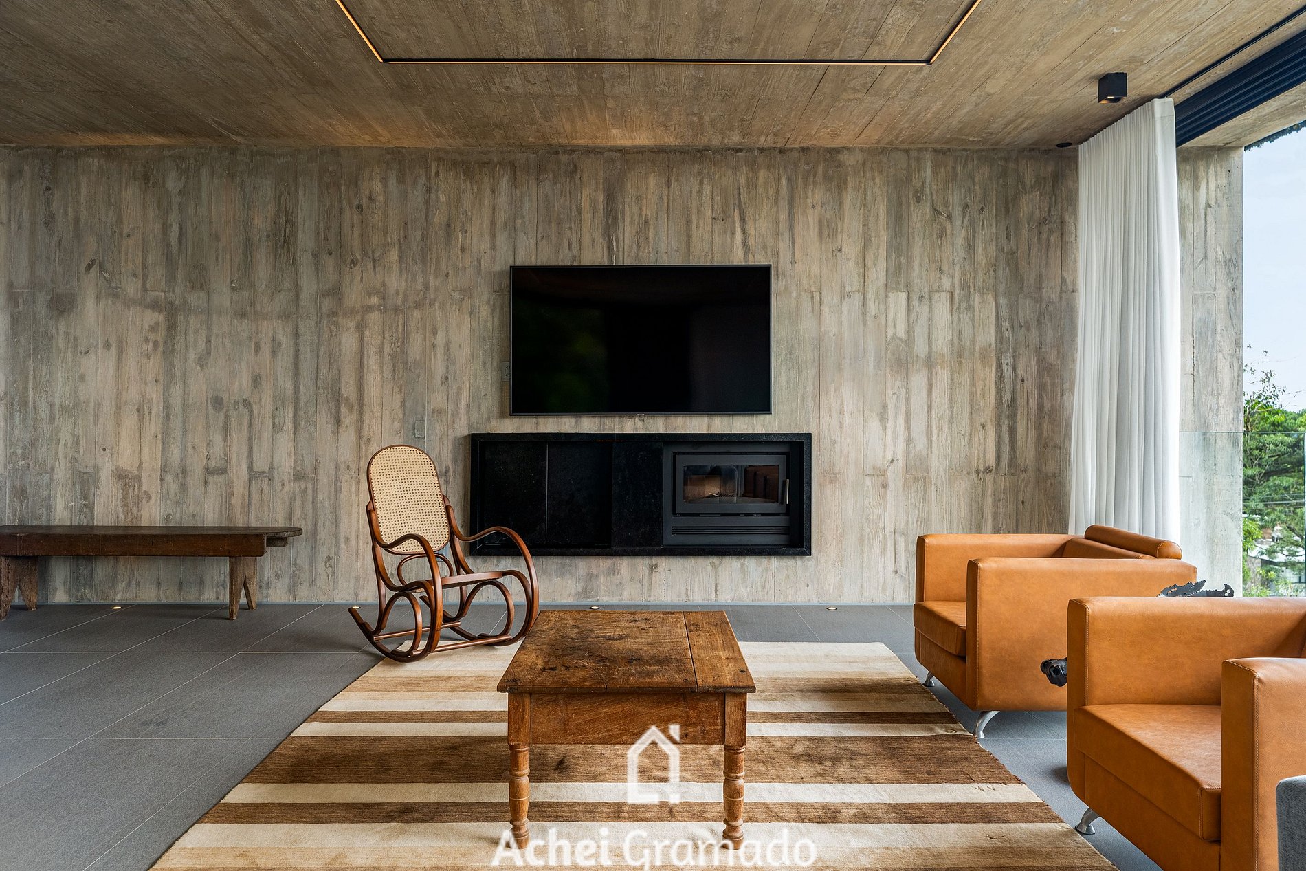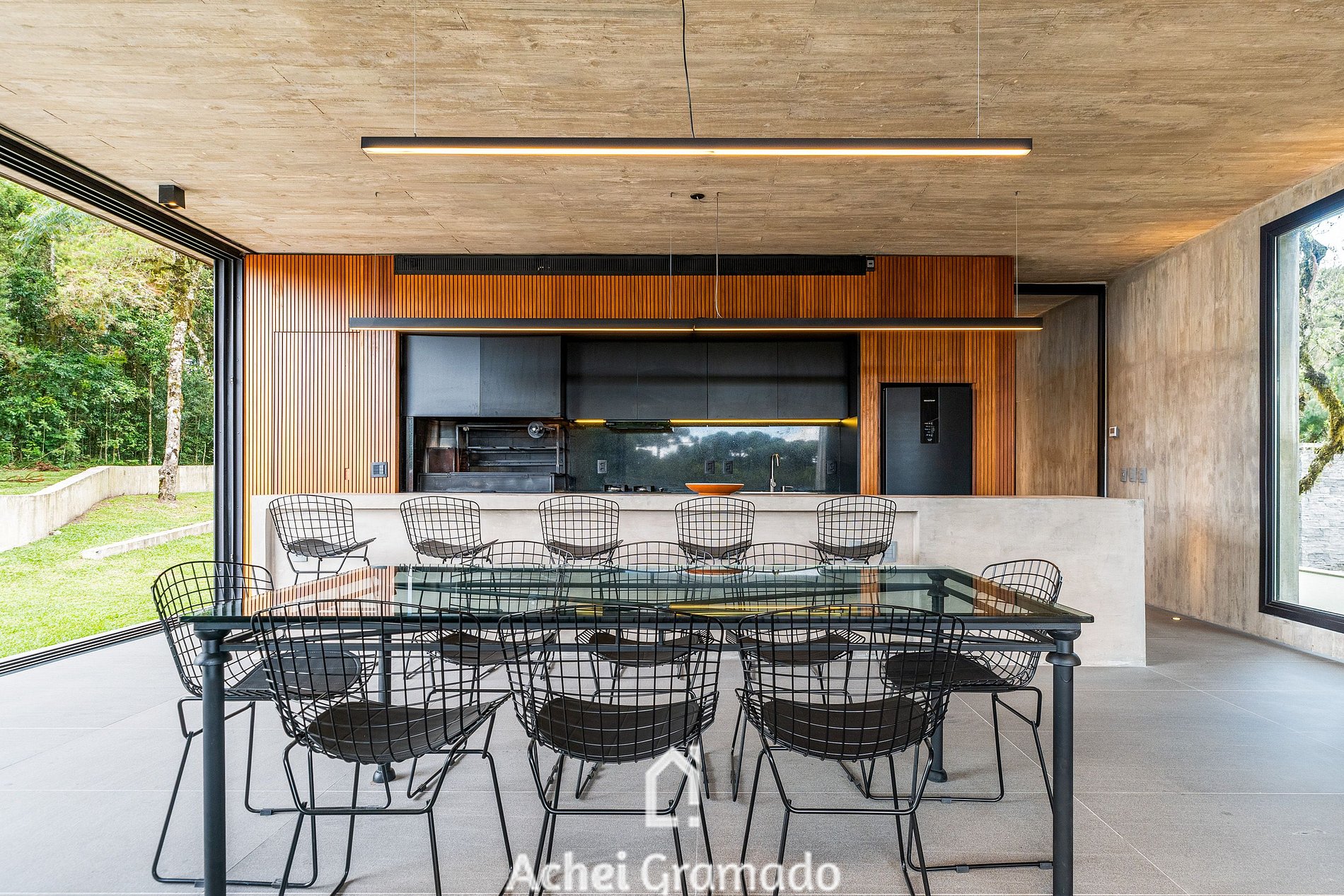 No exterior, um fire pit e um terraço cercado por araucárias convidam à contemplação. Casa Cave combina design, exclusividade e natureza para momentos inesquecíveis no Centro de Canela.