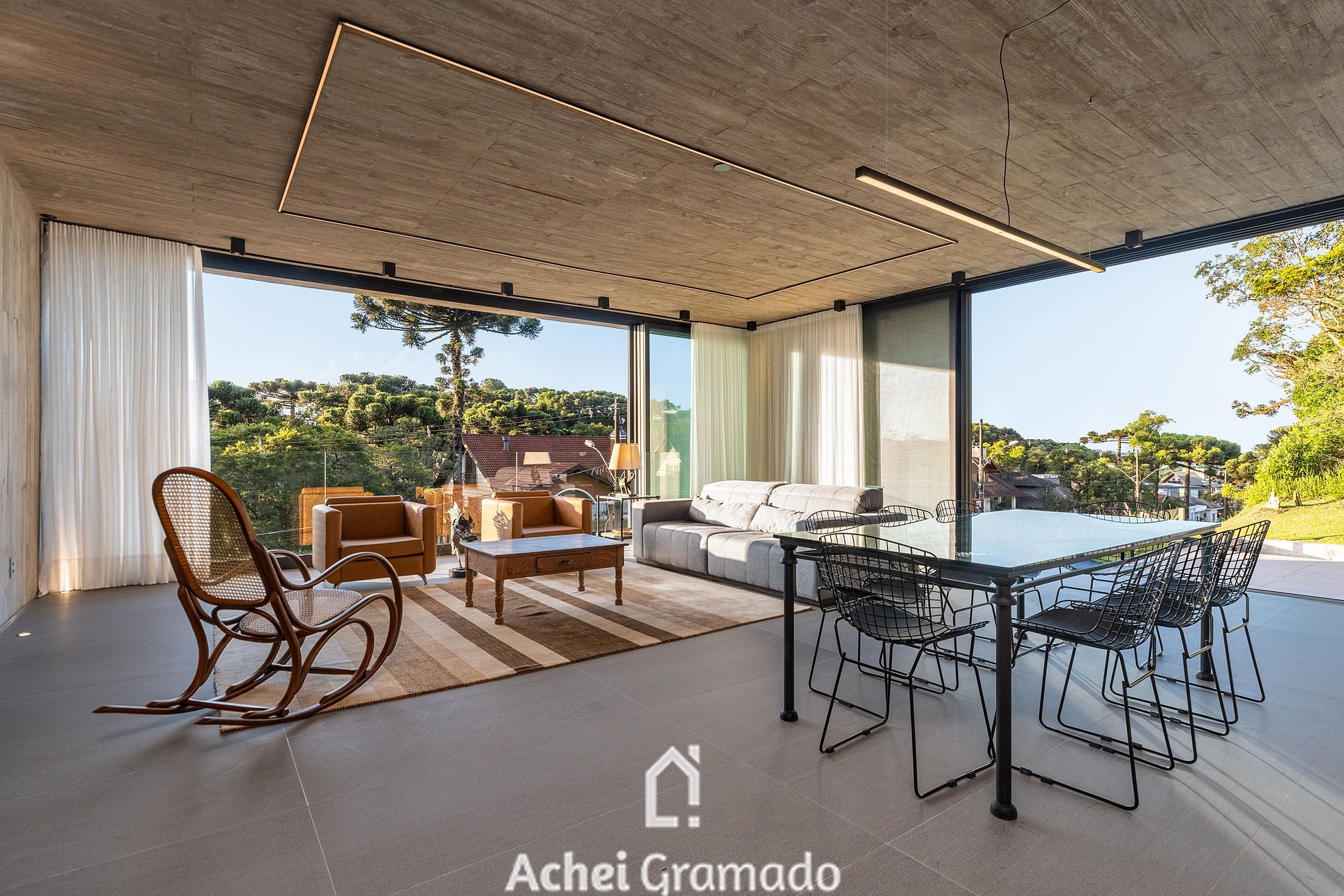 No exterior, um fire pit e um terraço cercado por araucárias convidam à contemplação. Casa Cave combina design, exclusividade e natureza para momentos inesquecíveis no Centro de Canela.