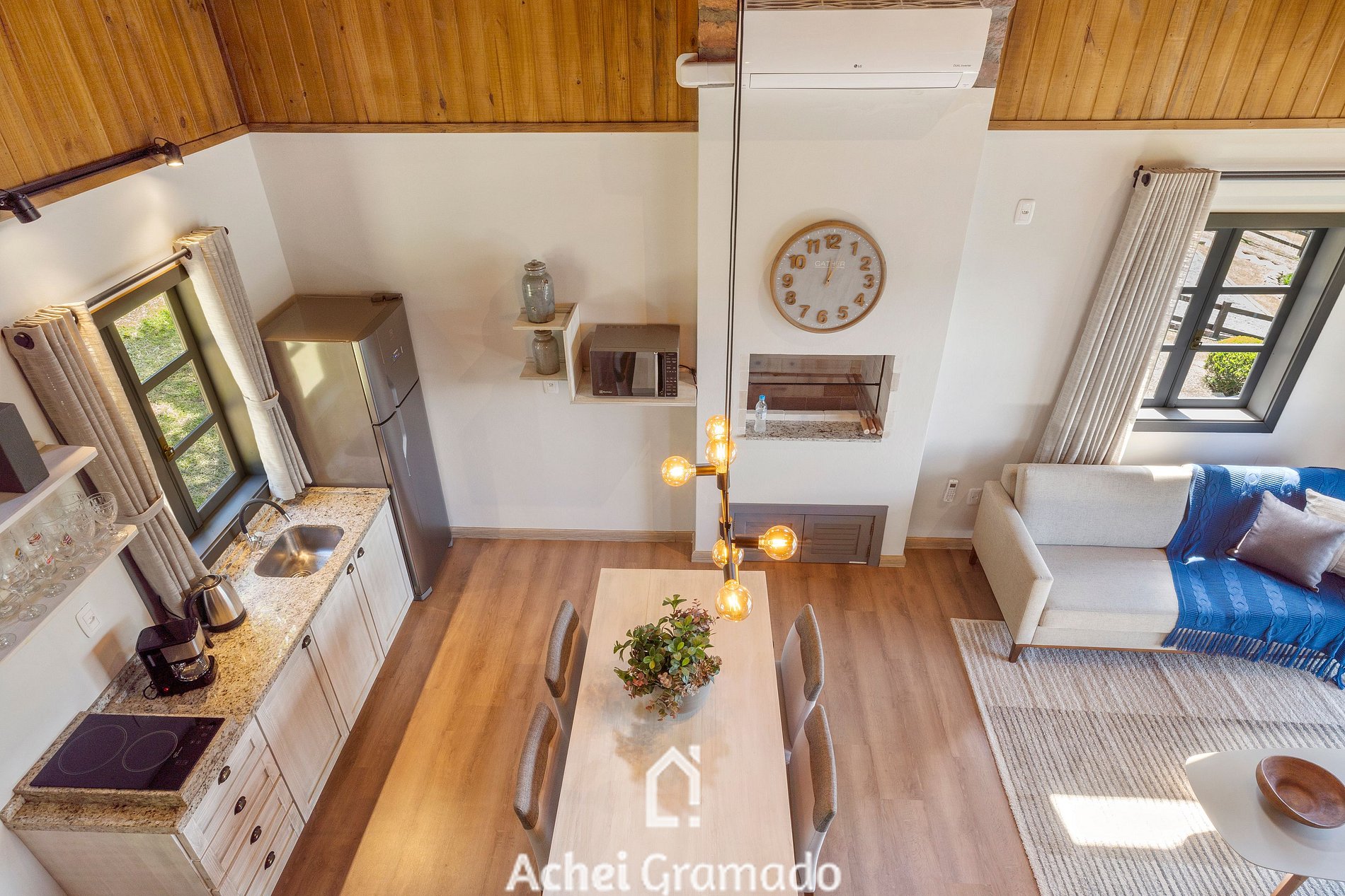A cabana também conta com 70m2 distribuídos em um ambiente especialmente integrado! Sendo uma suíte com banheira de hidromassagem, ar condicionado quente/frio. Espaço de convivência com lareira, mesa de jantar, cozinha completa com fogão de indução, churrasqueira interna, microondas, cafeteira, sanduicheira e os mais variados utensílios e taças! Smart TV de 50" na sala de estar, e Smart 42" na suíte, internet via fibra óptica e janela panorâmica com black-out, além de chuveiros e torneiras com aquecimento a gás.Não é fornecido lenha ou carvão para a lareira e churrasqueira.