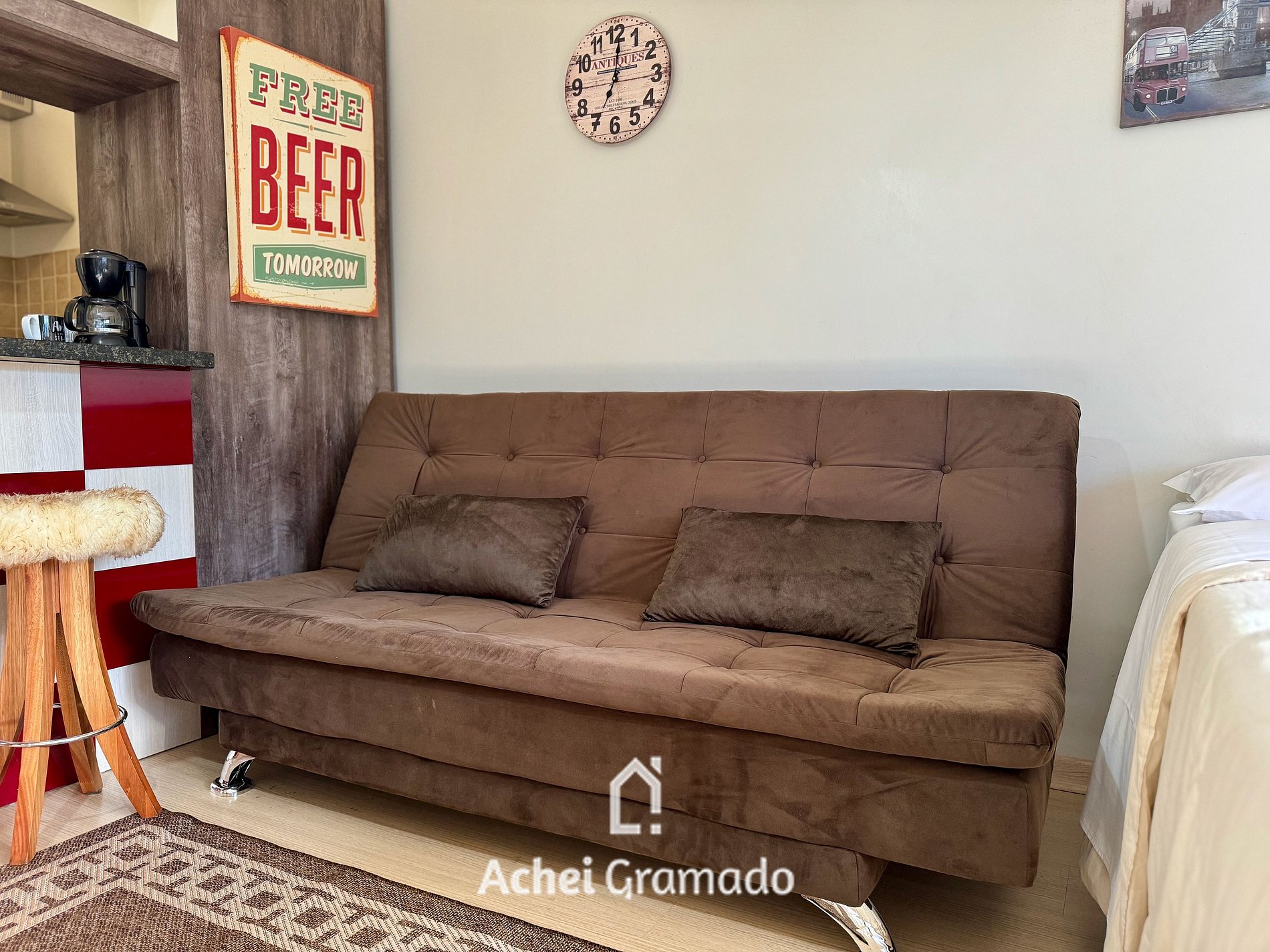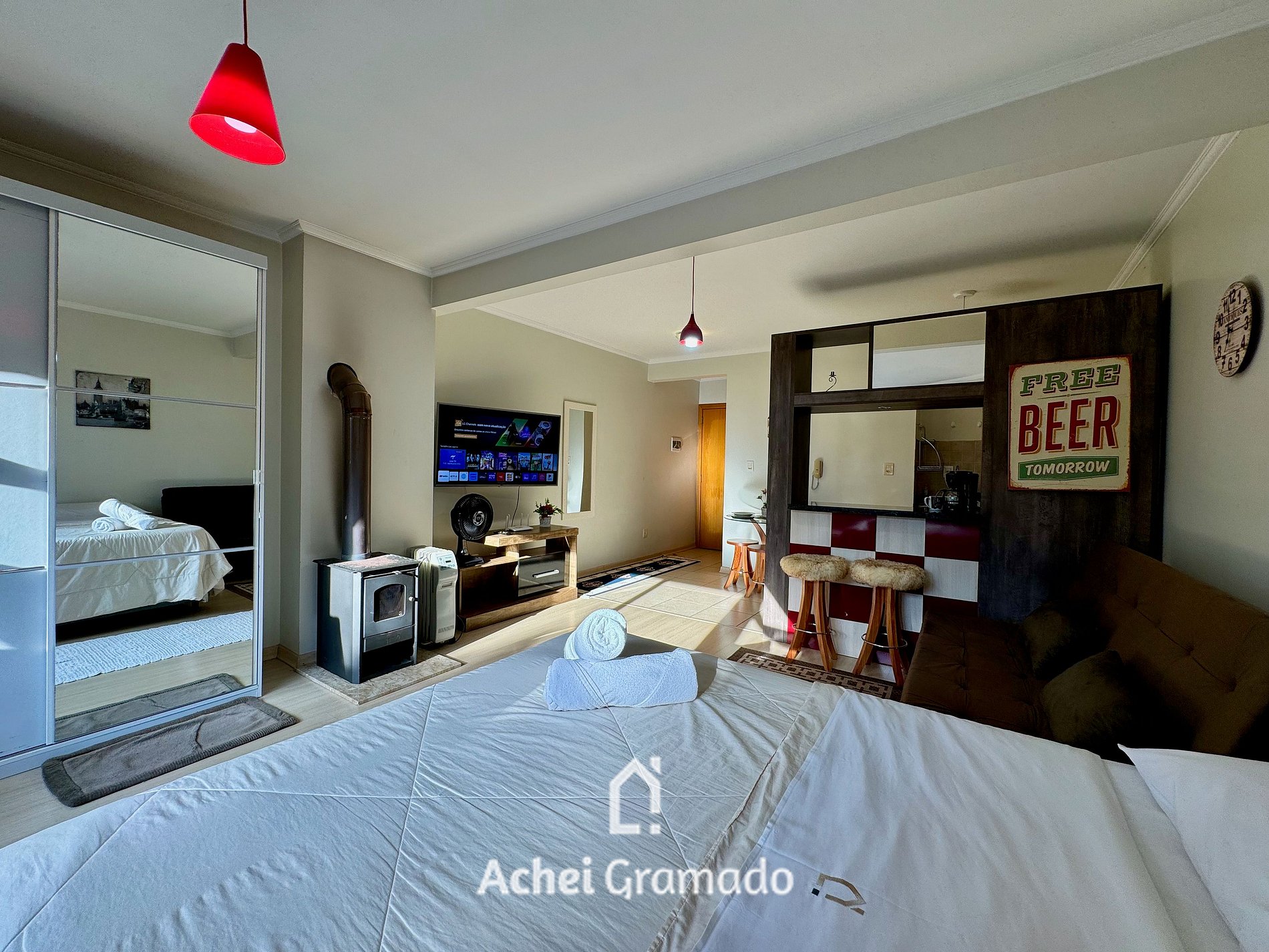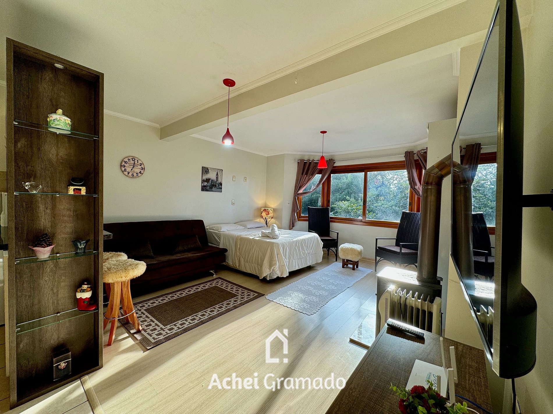 Este charmoso Estúdio super completo acomoda confortavelmente 4 pessoas. Duas em cama de casal box e outras duas no sofá cama, também de casal e com colchão novo. Smart TV e internet por fibra óptica. Possui lareira do tipo calefator, que também serve para aquecer o ambiente. Cozinha completa com fogão, forno, microondas, frigobar, cafeteira e torradeira. O prédio possui garagem coberta e fica ao lado do novo Hotel temático Chocoland e próximo da Expo Gramado onde ocorrem os shows do Natal Luz.