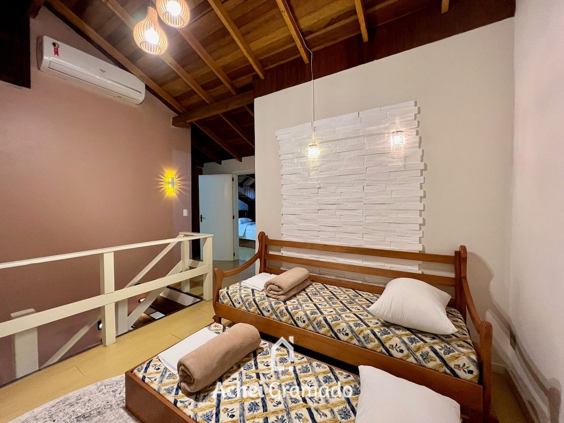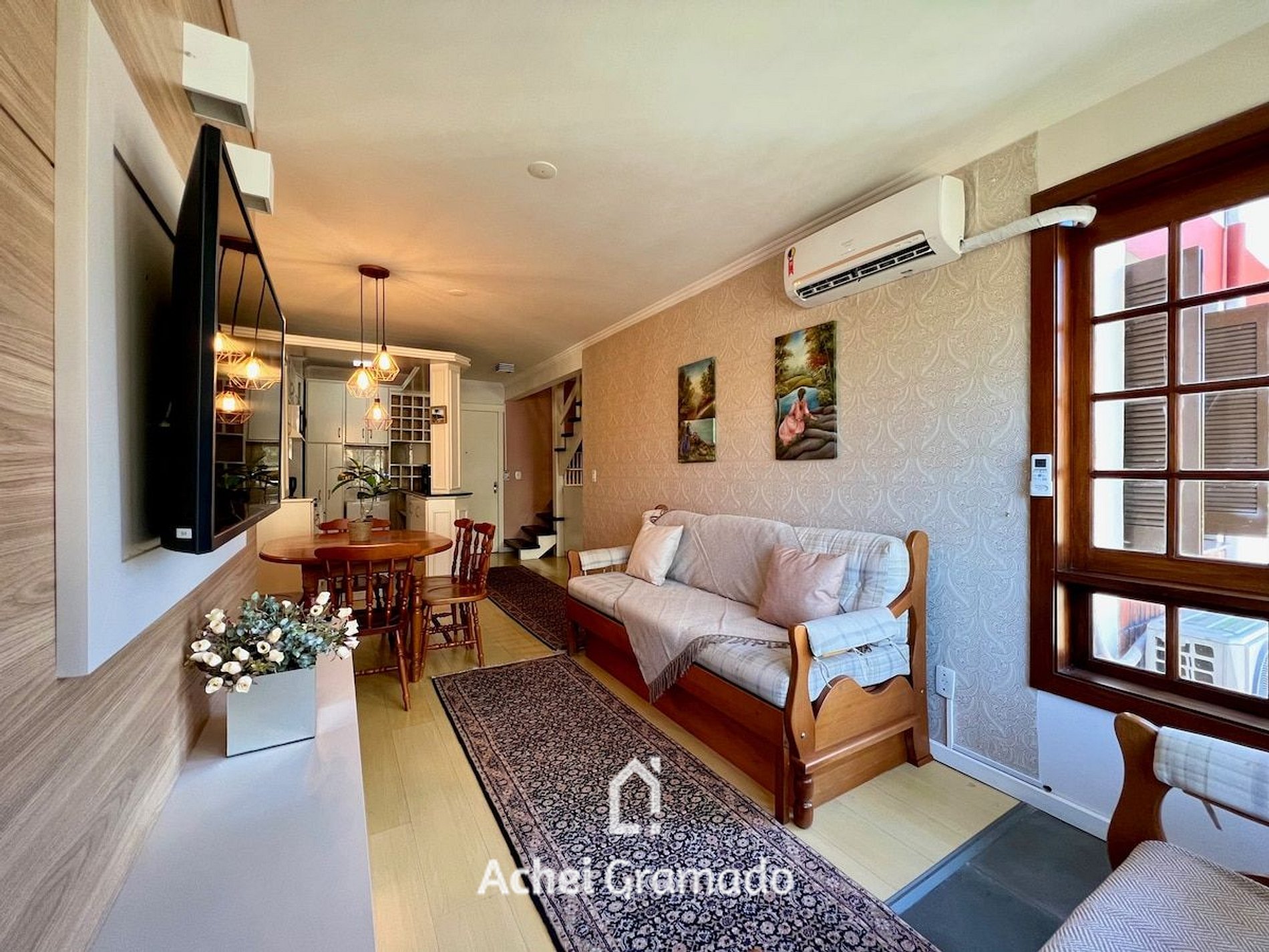 Esta belíssimo apartamento duplex fica no centro de Gramado, apenas 100m da ExpoGramado e 1300m da Rua Coberta. Além de muito completo, oferece amplo espaço: 120m2 em 3 dormitórios, ar condicionado quente e frio em todos ambientes, um quarto térreo, e dois no segundo andar, além de uma vaga de garagem privativa. Neste apartamento você poderá fazer muitas coisas a pé, tendo a comodidade de deixar o carro no estacionamento e contemplar com tranquilidade tudo que Gramado tem para oferecer!
