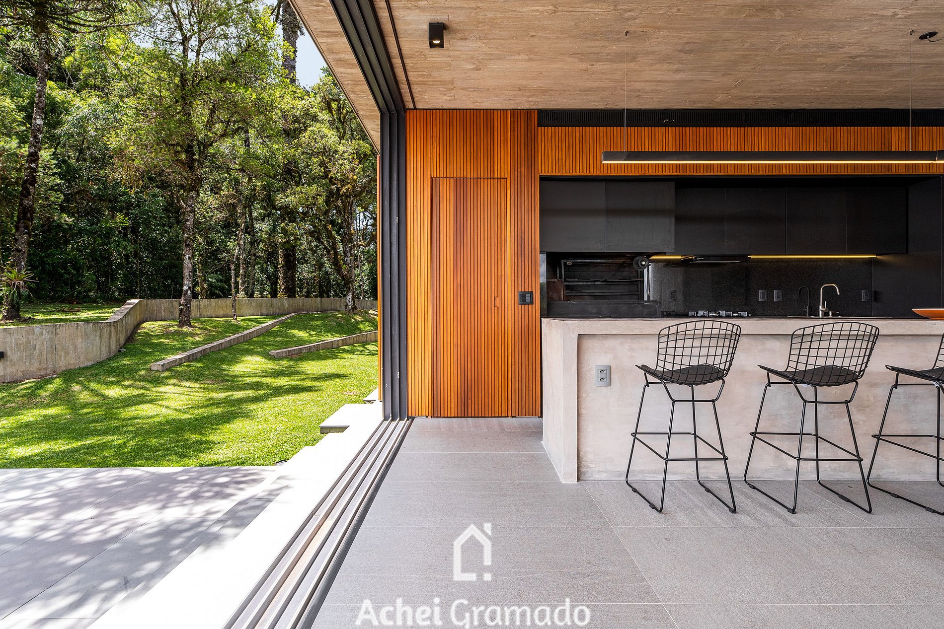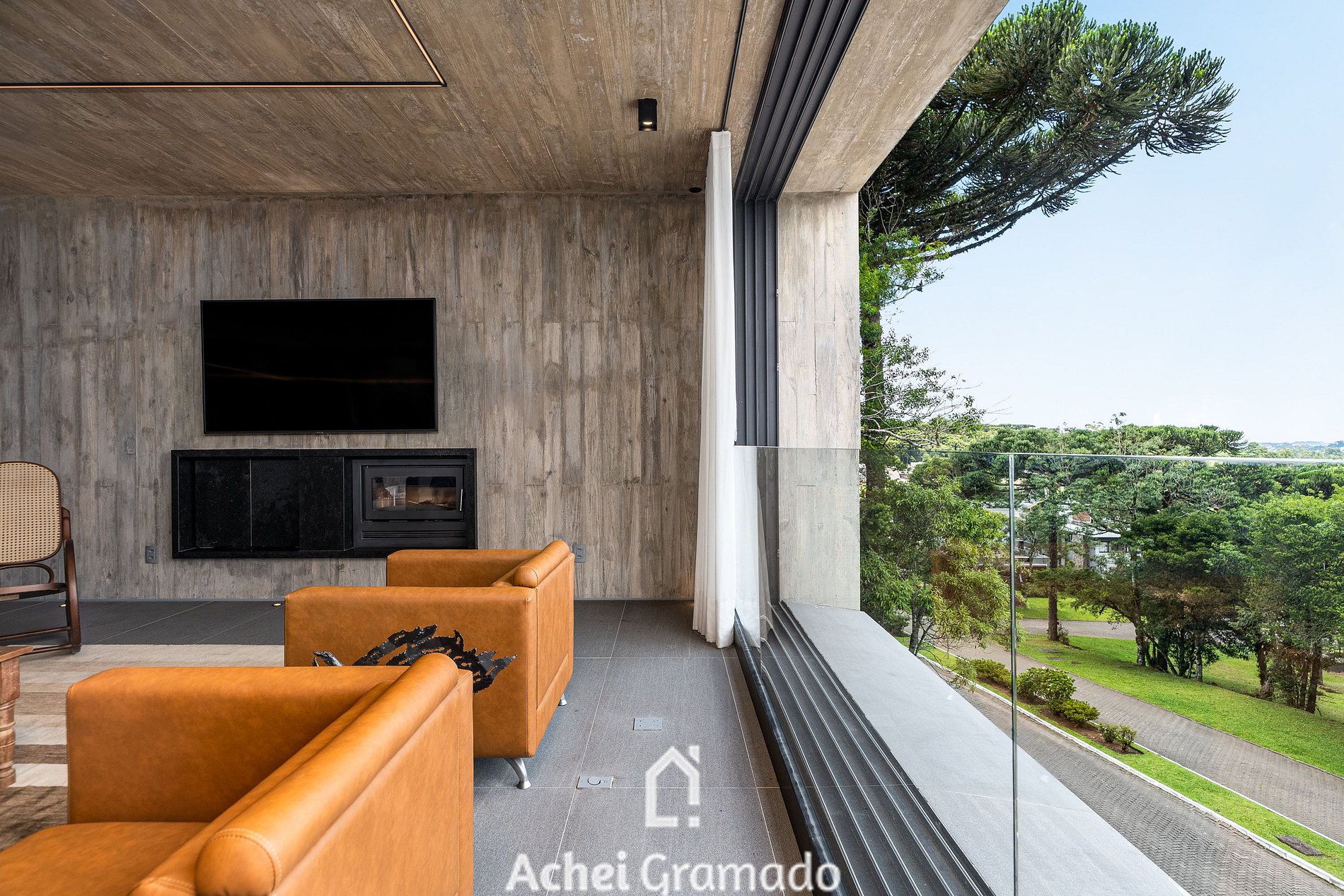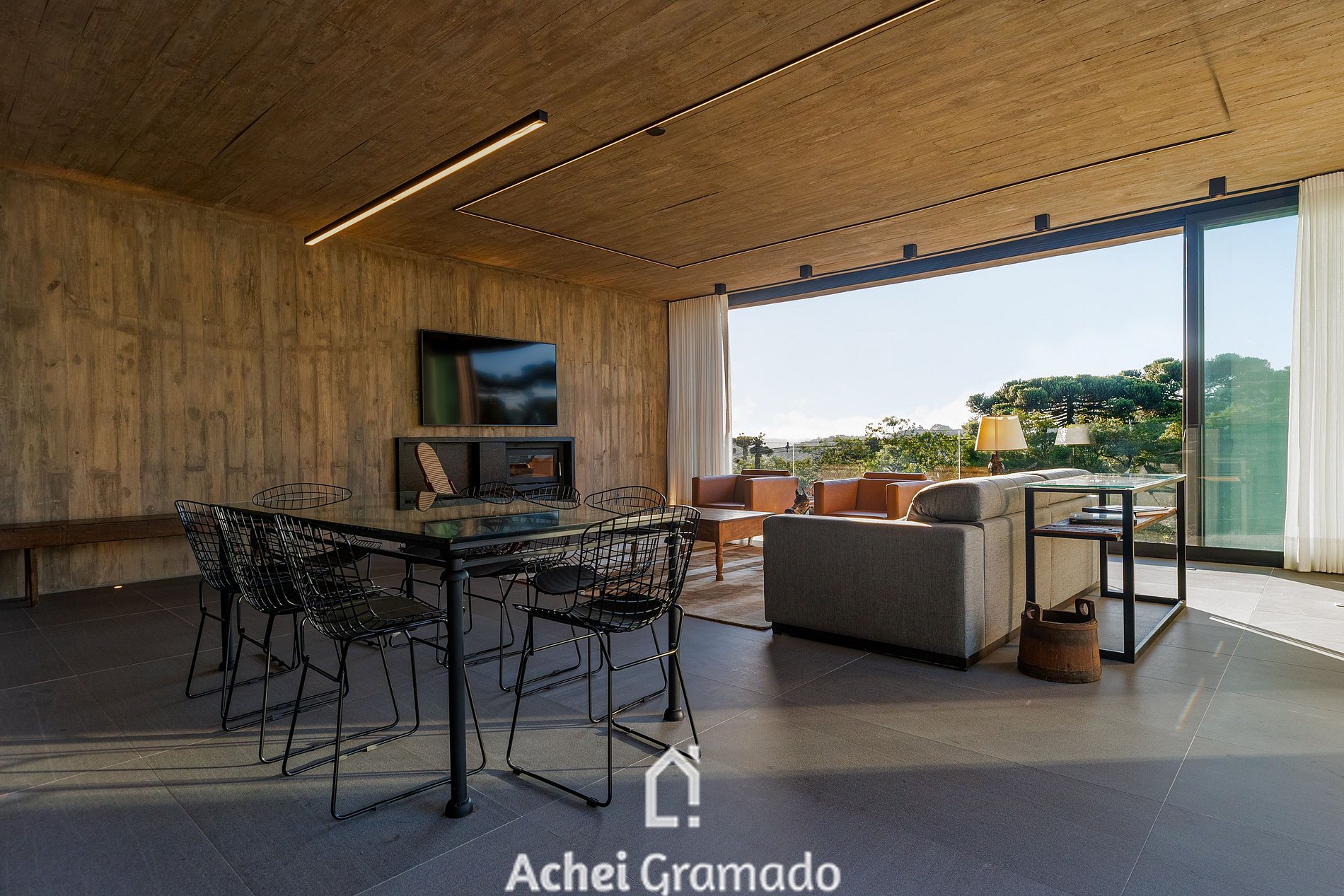 No exterior, um fire pit e um terraço cercado por araucárias convidam à contemplação. Casa Cave combina design, exclusividade e natureza para momentos inesquecíveis no Centro de Canela.