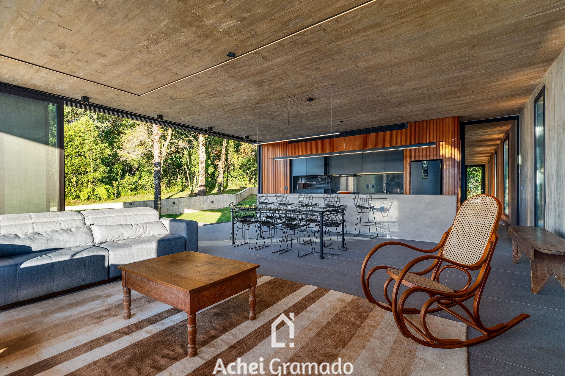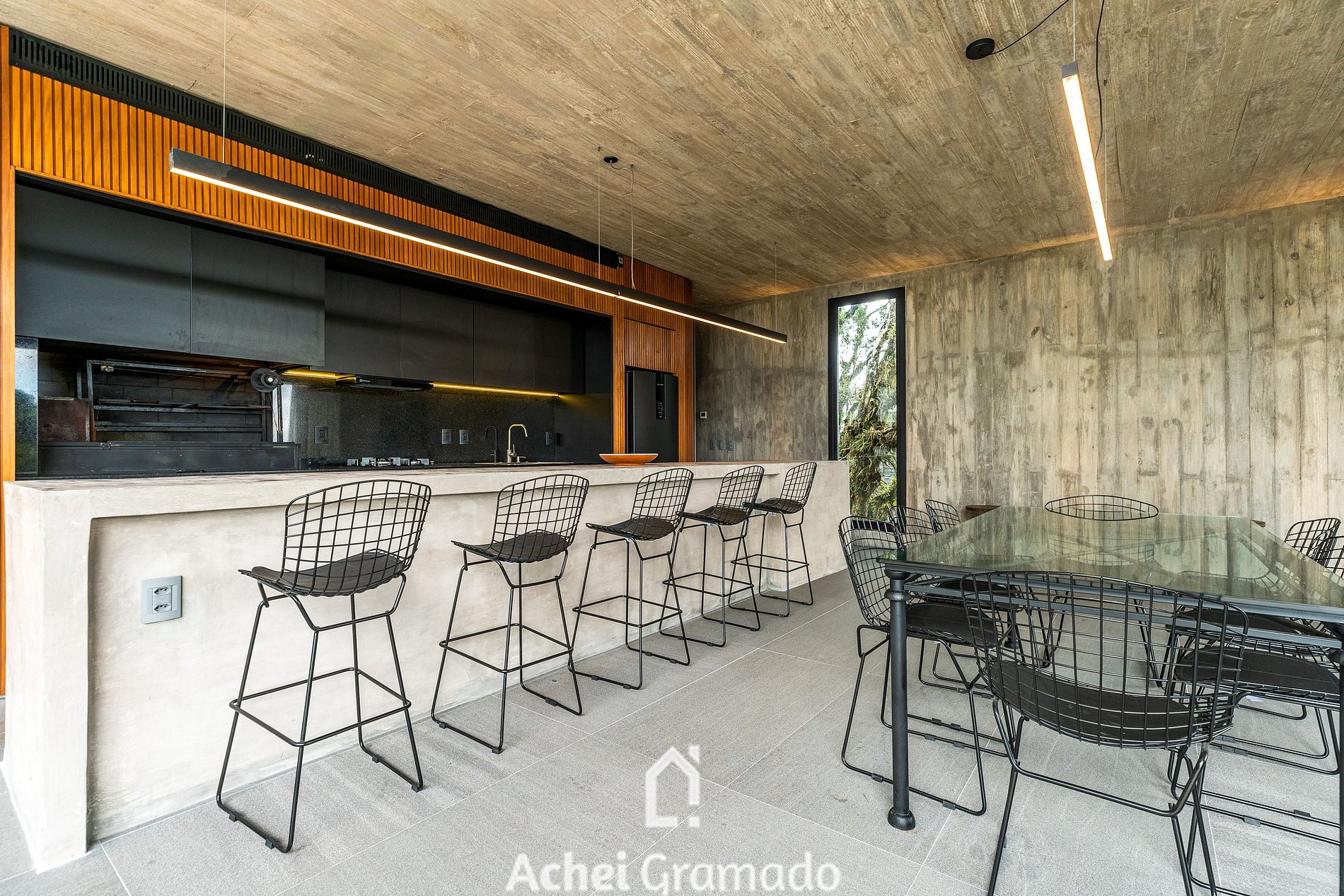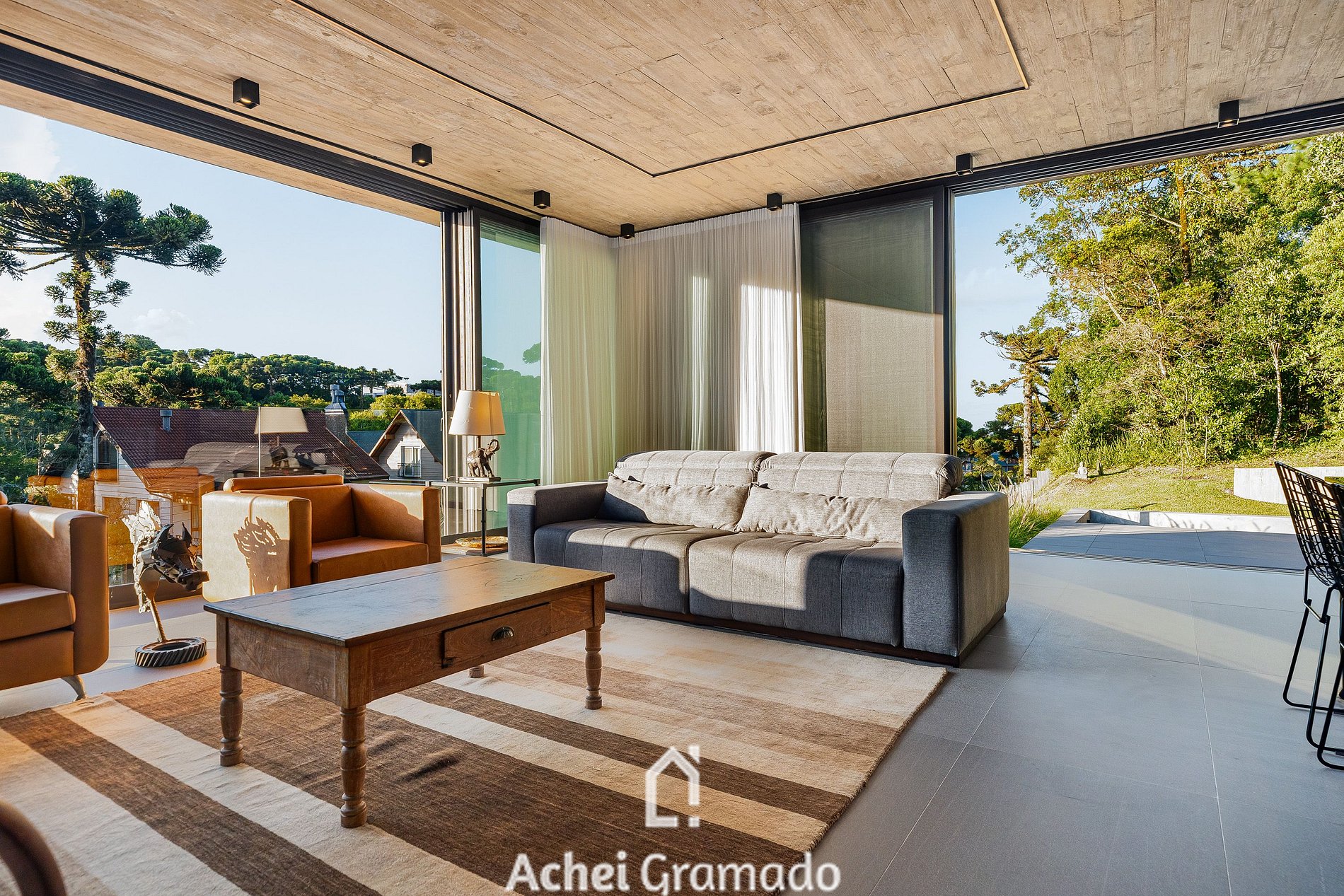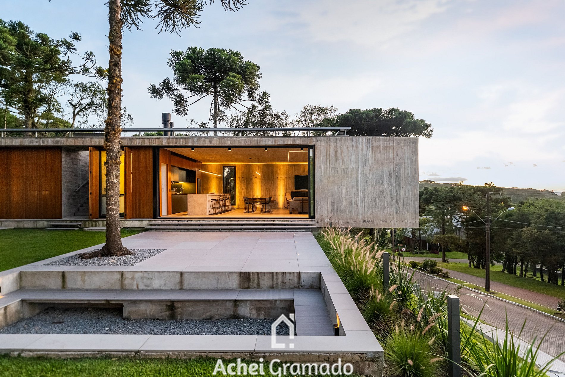 No exterior, um fire pit e um terraço cercado por araucárias convidam à contemplação. Casa Cave combina design, exclusividade e natureza para momentos inesquecíveis no Centro de Canela.