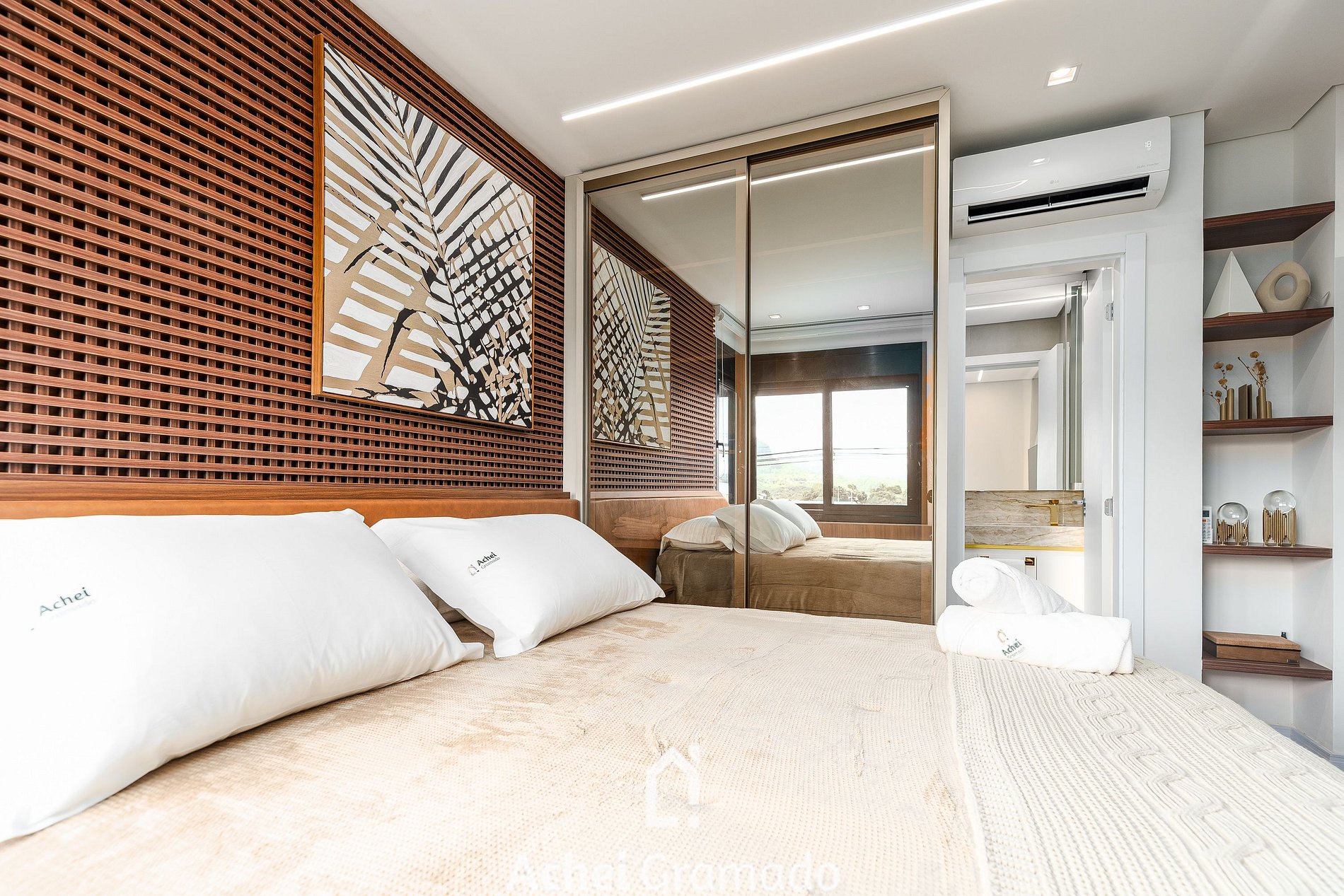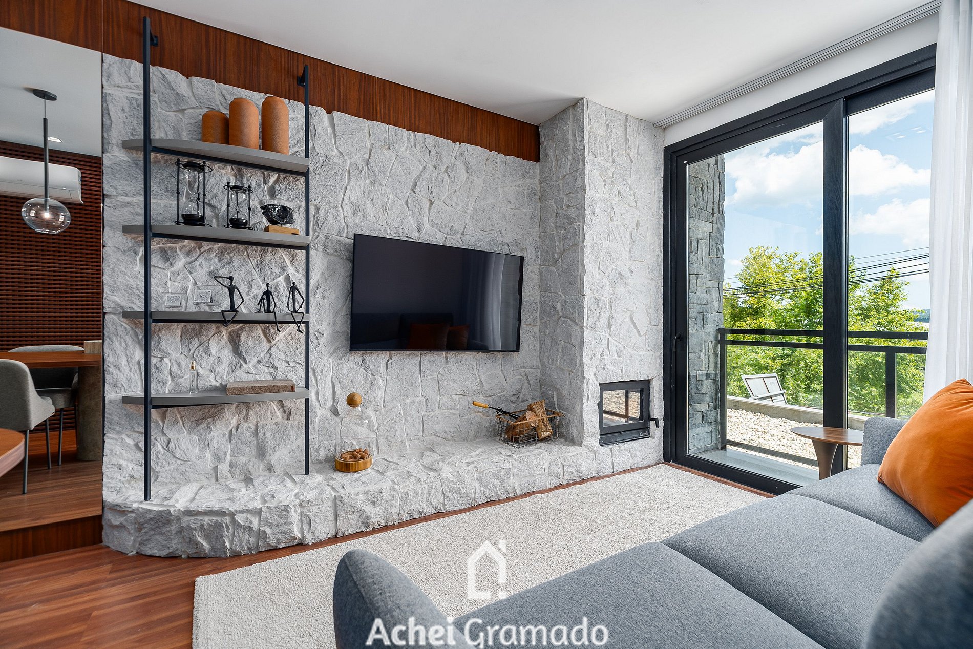 Com 78m², o espaço é totalmente automatizado via Alexa, conta com ar-condicionado quente/frio na sala e na suíte, lareira calefator, decoração elegante com pedra natural e muxarabi, além de um sofá Natuzzi com acionamento elétrico. Acomoda até 5 pessoas, distribuídas da seguinte forma: