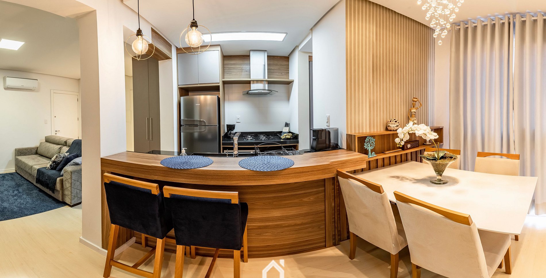 Se trata de um apartamento inteiro, com 45m2, com um dormitório e banheiro social completo, internet Wi-Fi por fibra óptica, Smart TV na sala e quarto, cozinha completamente equipada com cooktop, forno, microondas, liquidificador, torradeira, cafeteira e os mais variados utensílios e eletrodomésticos, sala de estar e jantar. O local ainda conta com chuveiros e torneiras com aquecimento a gás, sofá-cama na sala, e no dormitório uma cama de casal queen, uma cama de solteiro com um colchão extra de solteiro. O imóvel ainda disponibiliza vaga de garagem coberta, privativa no mesmo prédio do apartamento.